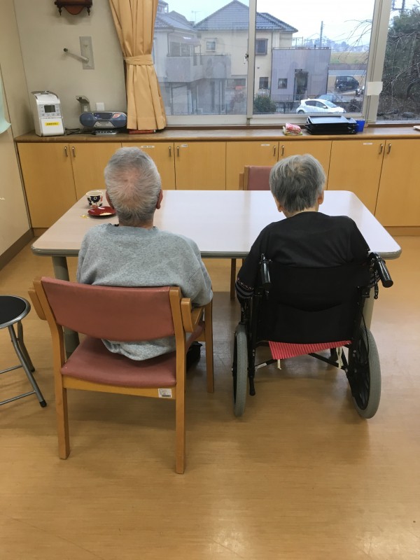 先日のおやつ後、ひだまりでのんびりしているご利用者様を発見。後ろから写真を撮影しました職員。