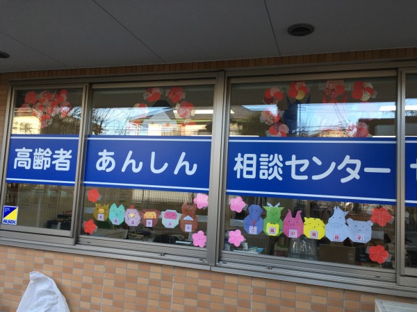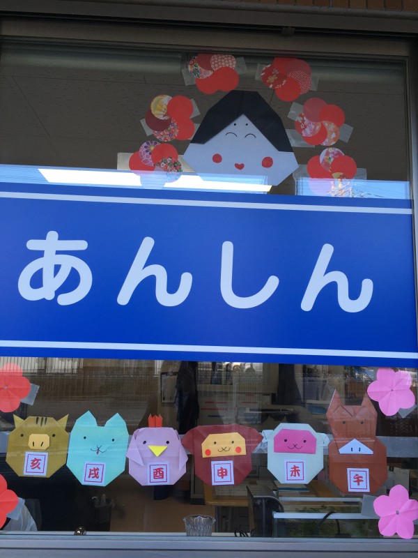 鬼とおたふくも窓に飾っていますよ。せせらぎの近くにきた方は窓にも注目してみてくださいね。