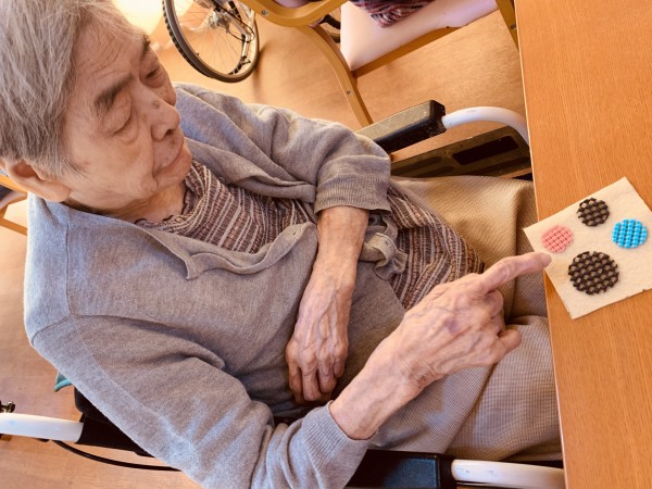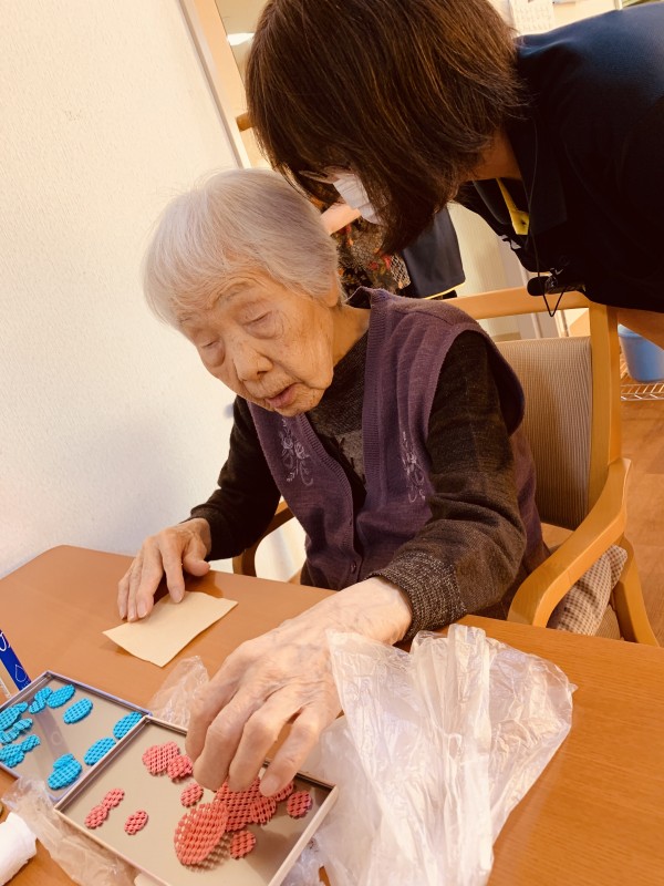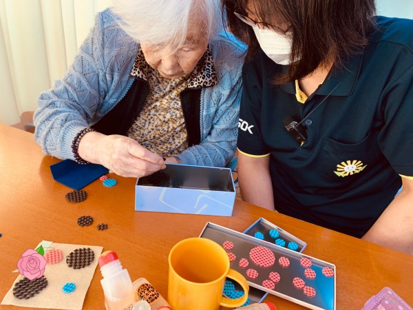 ↑「そこにそれはって!」「これはそこ!」と手芸ならぬ口芸でコースターを作成する入居者さま&入居者さまの手となるおーたケアスタ