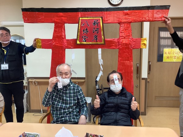 1月4・5日に初詣を行ないました! まずは鳥居をくぐり、お賽銭をします お金はデイサービスの手作りお札を使っています( ・∇・