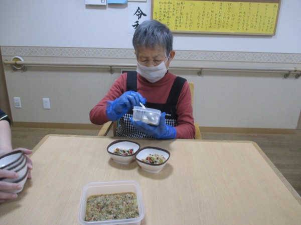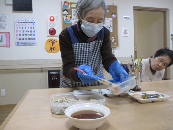 新しいご入居者様も職員と一緒に盛り付けのお手伝いをしていただきました。