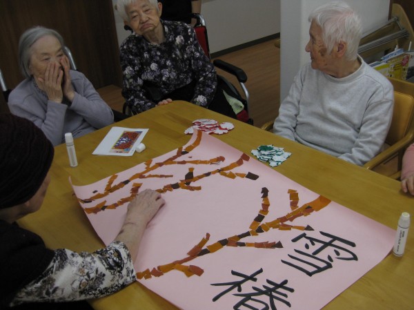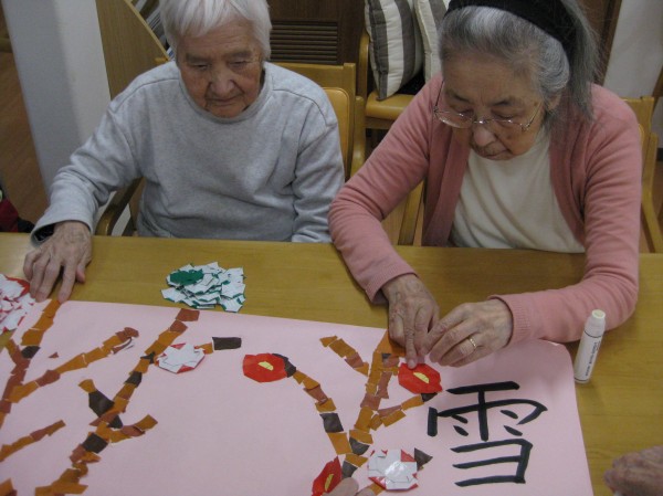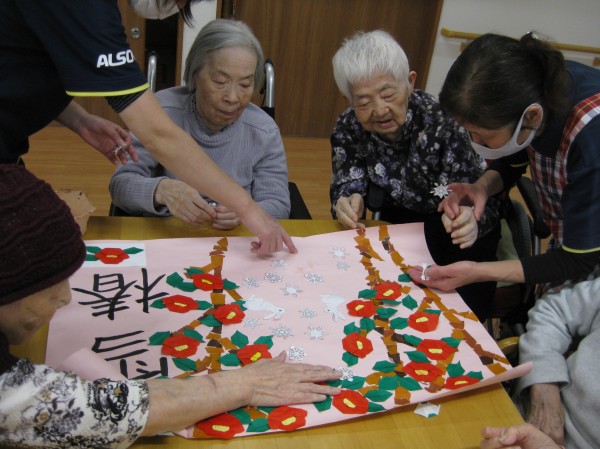 みんなで協力して、雪椿の貼り絵制作をしました!
