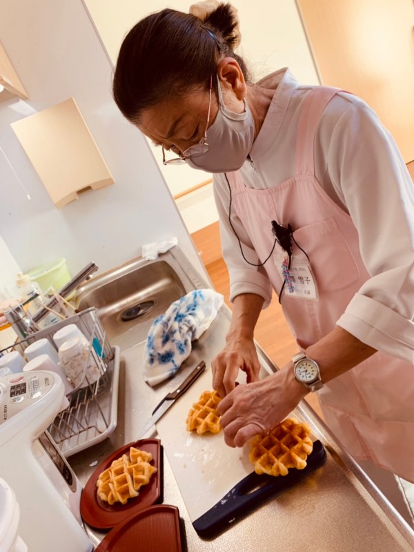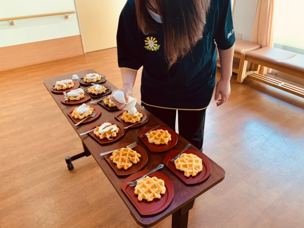 本日のスイーツは『ワッフルの生クリーム添え』でございます♪ワッフルを召し上がれない方には、『モンブランカスタードプリン』なぞ御用意させて頂きました!