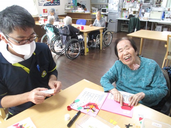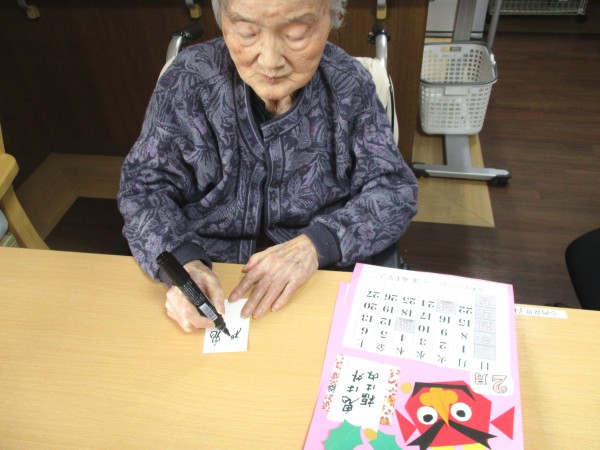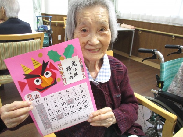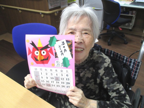 赤い台紙に赤鬼と2月の暦を貼りました。