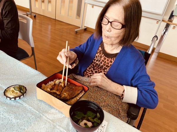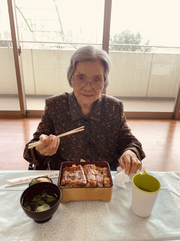 「寿司よりうなぎ」と確固たるうなぎ派の入居者さま!!うなぎを前にスマイル⸜(*ˊᗜˋ*)⸝