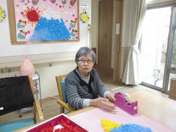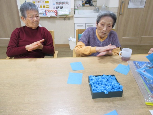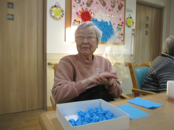 ご入居者様にレクリエーションで何色かのお花紙をくるくる丸めていただいています。