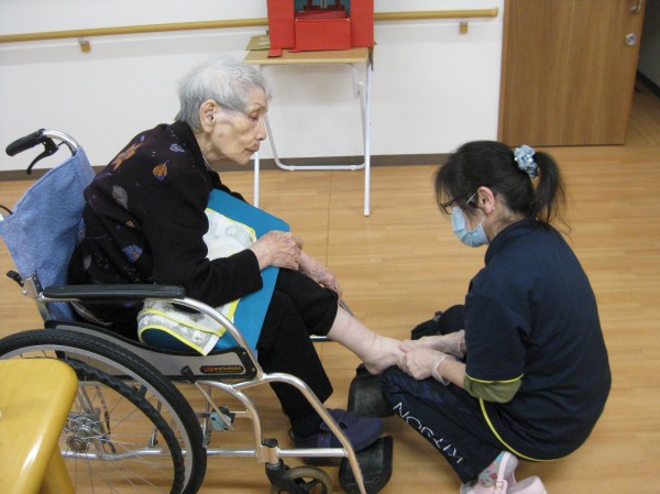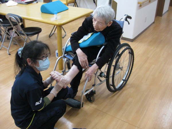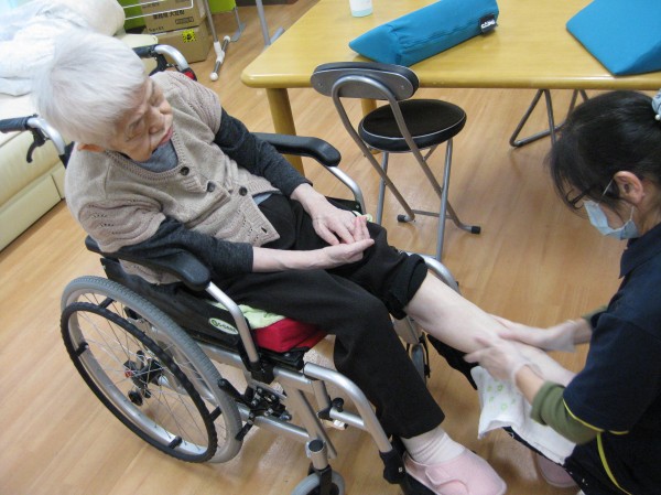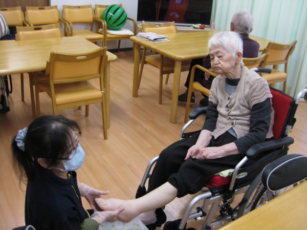 こんにちは!グループホームみんなの家・あきがせの介護ブログです。よろしくお願いいたします。車椅子対応になられたご入居者様が増えてきたため、浮腫み予防に努めています。足の上げ下げをしたりと工夫をしています。今日はセラピーを取り入れて浮腫み予防をしています。少しでも浮腫みの解消ができればと考えています!!