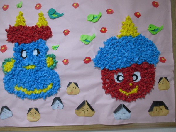 1階は、鬼の顔が完成しました。くるくる丸めたお花紙で表情豊かな鬼が出来上がりました❣