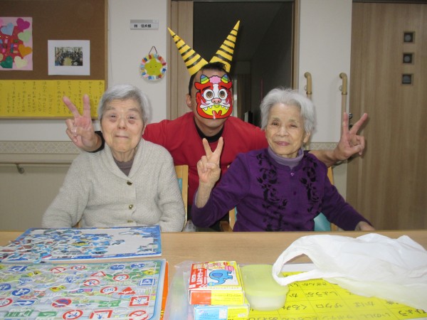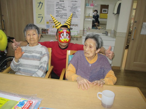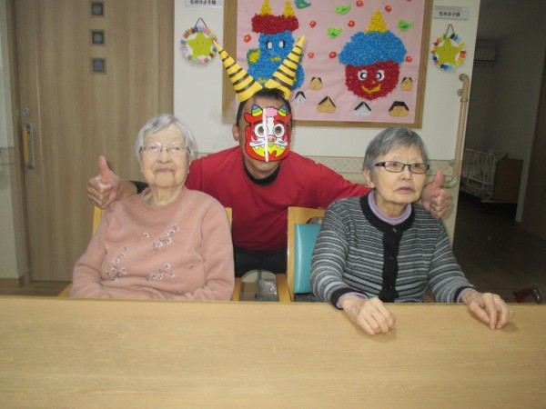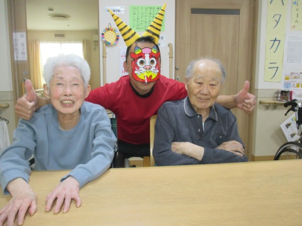 ホームにも赤鬼が現れ、ご入居者様、職員も一緒に「鬼はそと~!」と大きな声で豆まきしました。