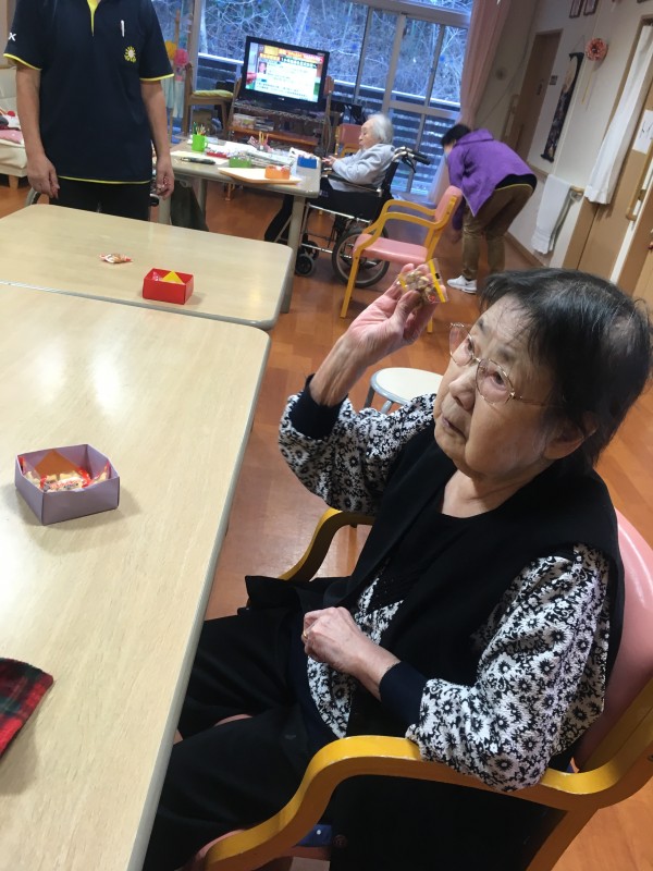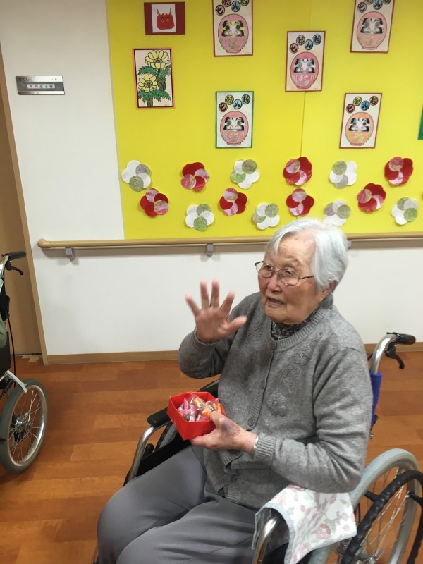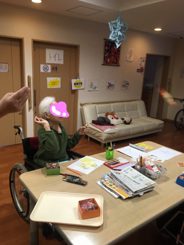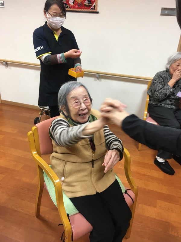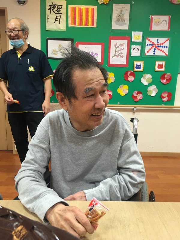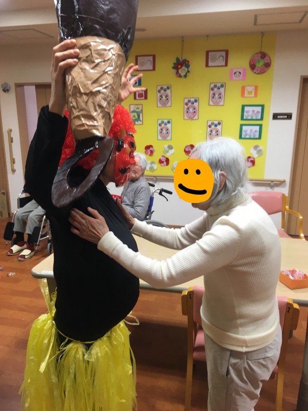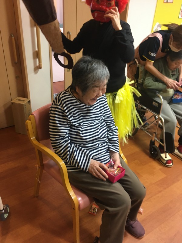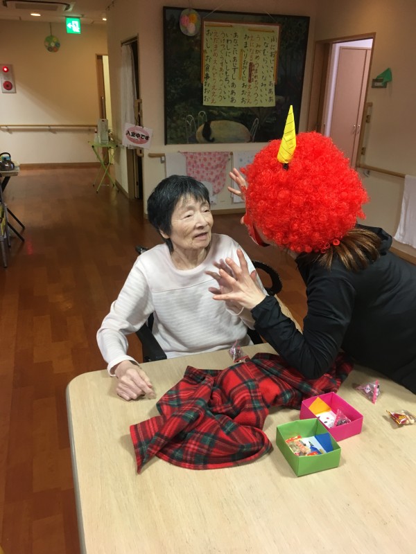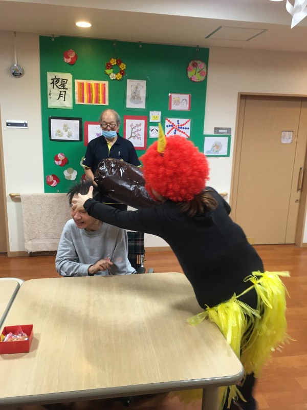 ご利用者様が豆をぶつけて追い払う様子が、なんとも滑稽で