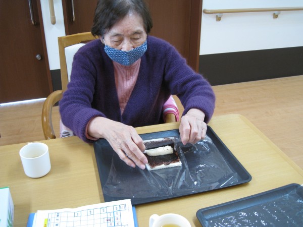 そして、恵方巻をまねて、食パンにバナナやチョコレートクリームや、ホイップなどを塗り、巻き巻き。
