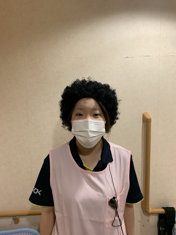 喜んでかぶる、内田看護師。