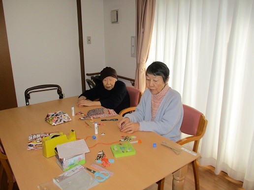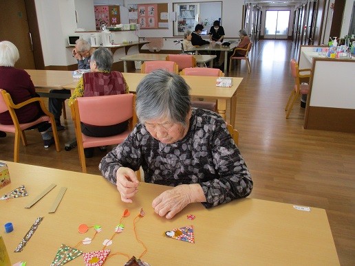 2階の入居者様もスタッフと一緒にひな祭りに向けて作業を始めました(*^^*) 折り紙で折った雛人形など赤い紐に付けて…