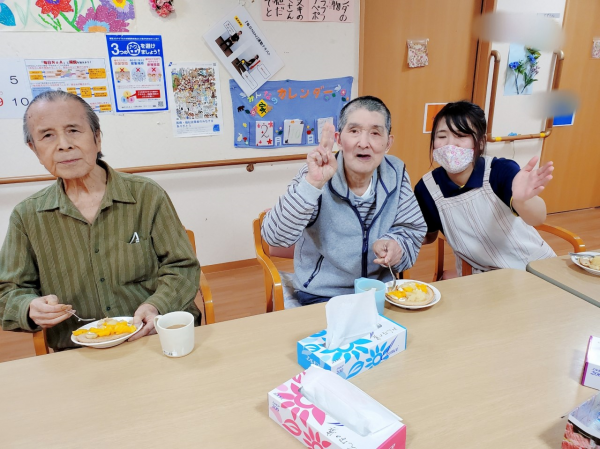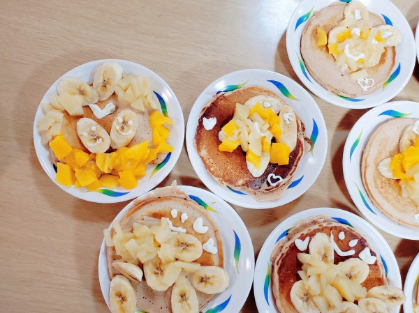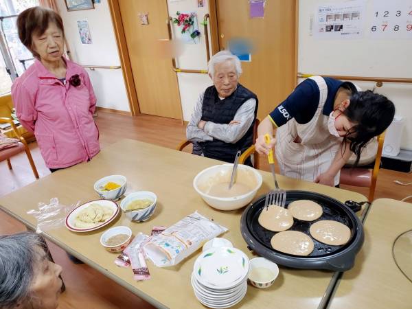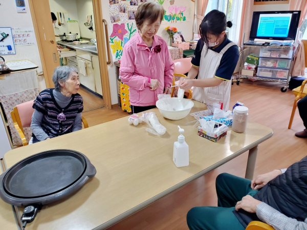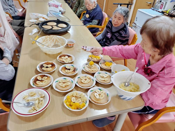 私達のフロアではココアパンケーキフルーツと共にを、利用者様にお手伝い頂きながら作りました。