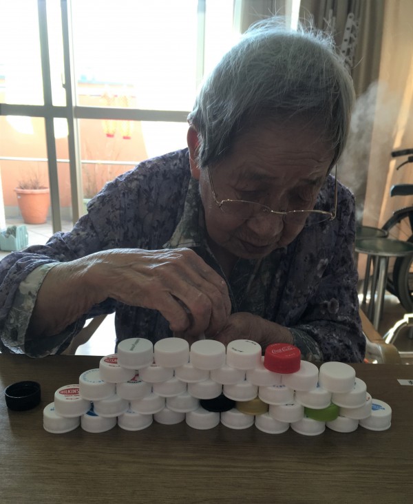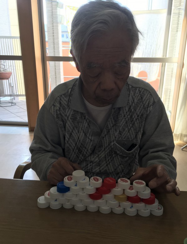 今日のレクは、ペットボトルキャップタワーゲーム!