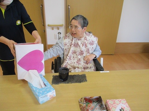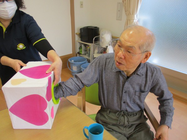 スタッフお手製の箱に入居者様の手を入れてガサゴソ…