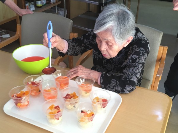 こっちのチームは刻んだフルーツ缶を器によそいます。この方は桃担当。
