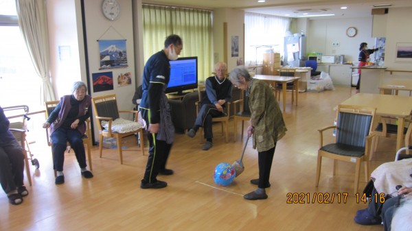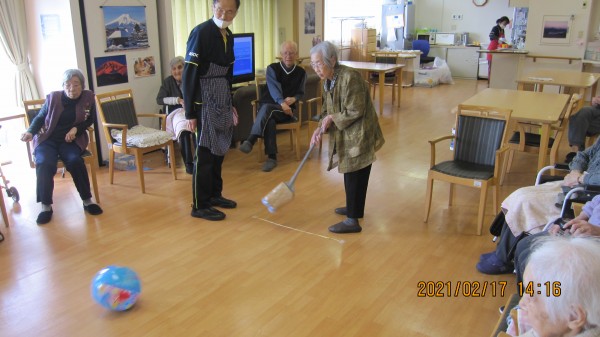 ほうきをパター代わりにするもよし、直接投げるもよし、ビーチボールをバケツの的に狙う単純なゲームですが、これが盛り上がるんですよね~!
