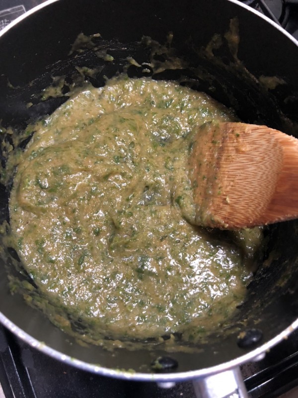 半分ほどに切ってから茹でて灰汁を抜き、細かく刻んで炒め、