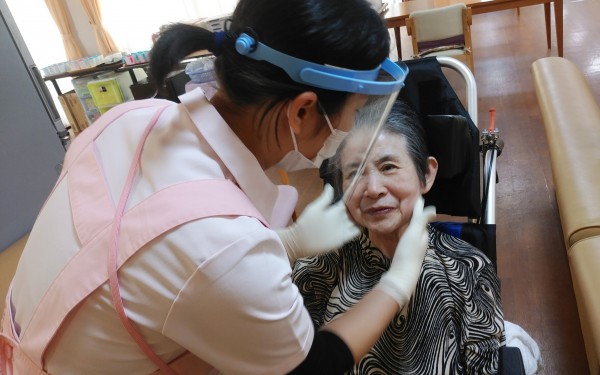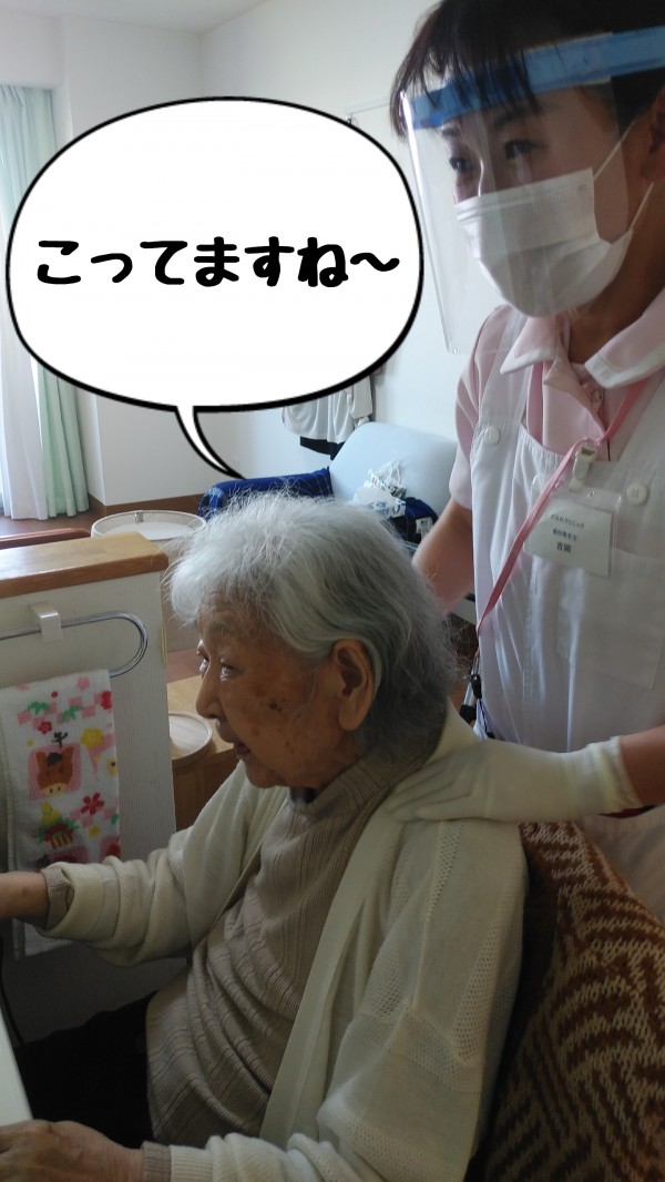 ご入居者様に、いろいろと話しかけて行ってくれます。見つめ合い、信頼感もバッチリです。