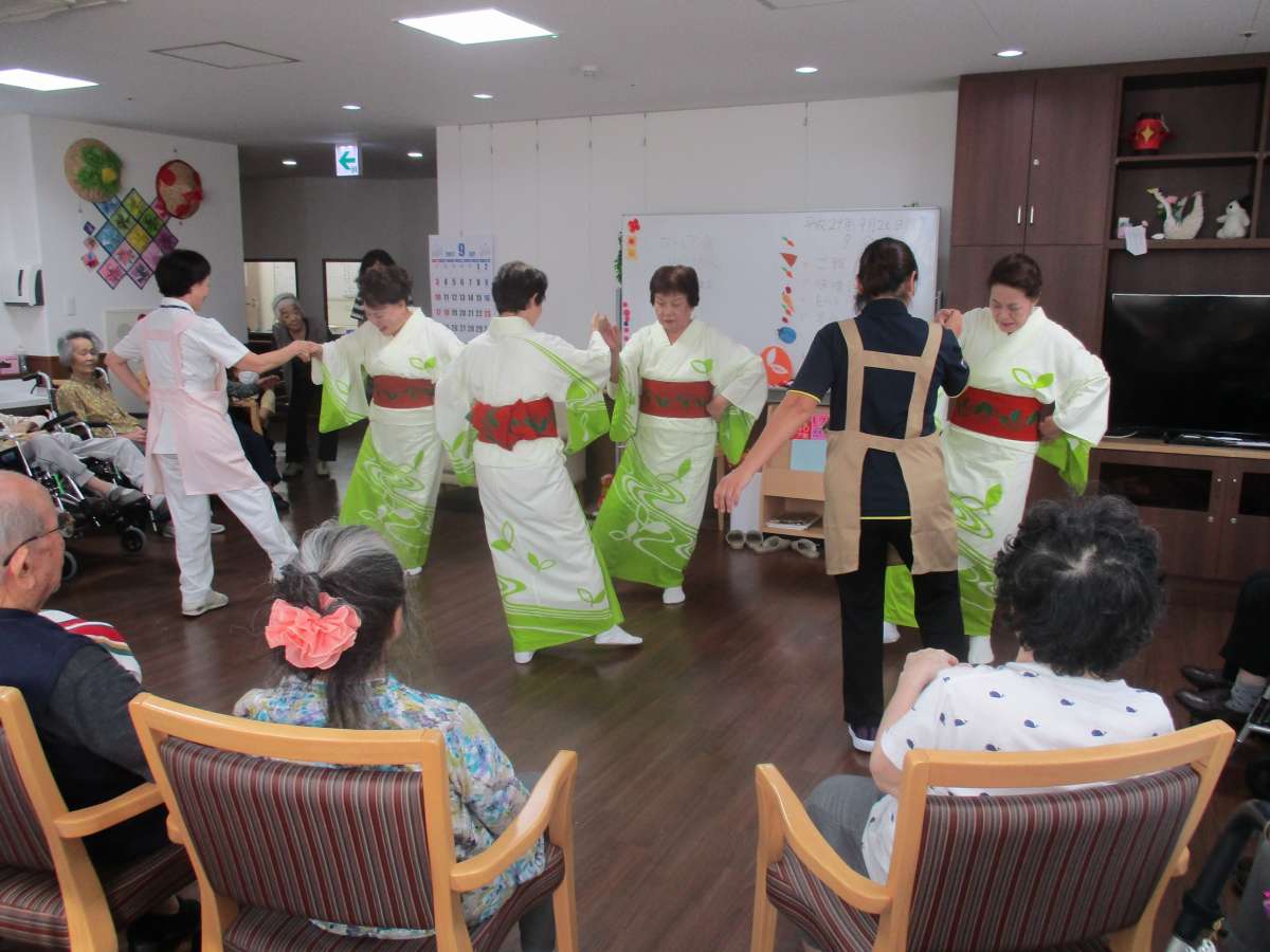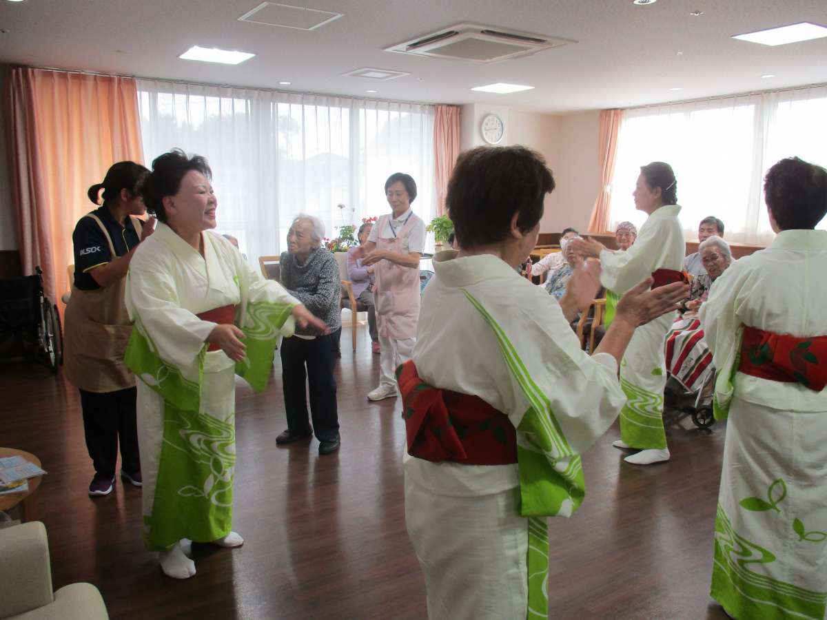 介護付有料老人ホームみんなの家与野公園の夏まつりにもご参加いただきたカトレア会のみなさんの再登場です!ご利用者様みなさんがよくご存じの曲で踊りを披露していただきました。秋になったとは言え、まだまだ暖かい日が続く今日この頃ですが、会場の熱気も最高室温更新!とばかりに高まっていました。カトレア会のみなさんの華麗な踊りに魅了されながらも、民謡に体がうずくご利用者様は、その輪の中に入り、一緒に踊られていました。今後、定期的に開催する予定です。ぜひ、ご期待ください。