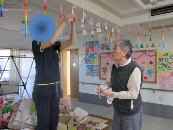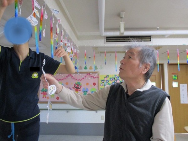 高い場所の飾りつけは、背の高い男性利用者様が手伝ってくれました!