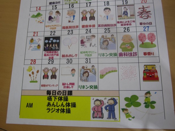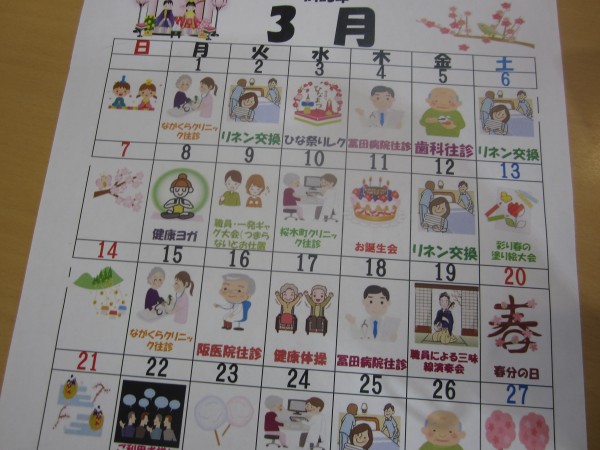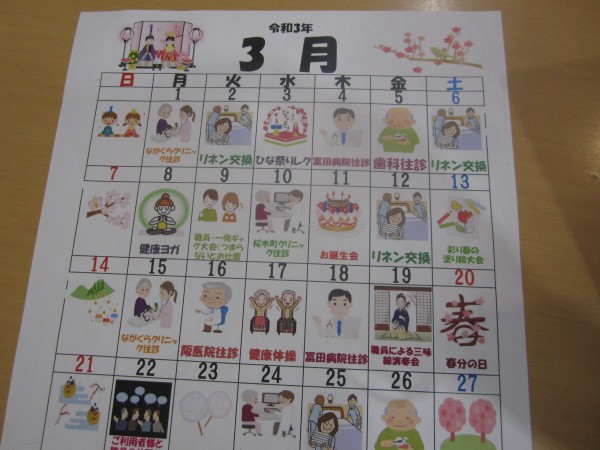 旬なイベントや食のイベントなど予定しております。3月はひな祭りの日にレクリエーションがあります(^^♪