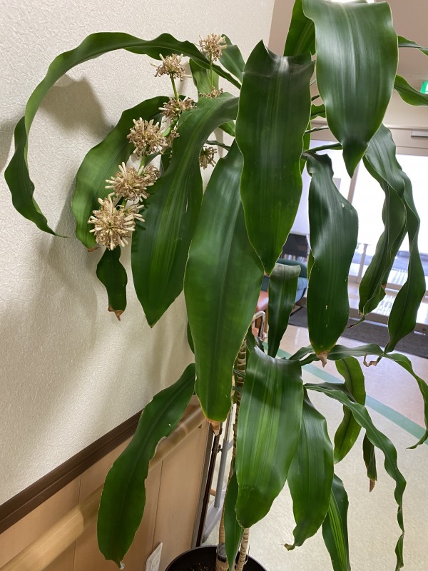 デイサービスの玄関先に置いてあった観葉植物に突然花?が咲きました( ゚Д゚)