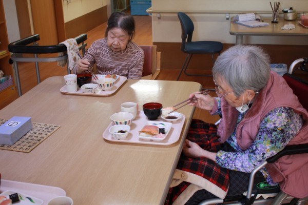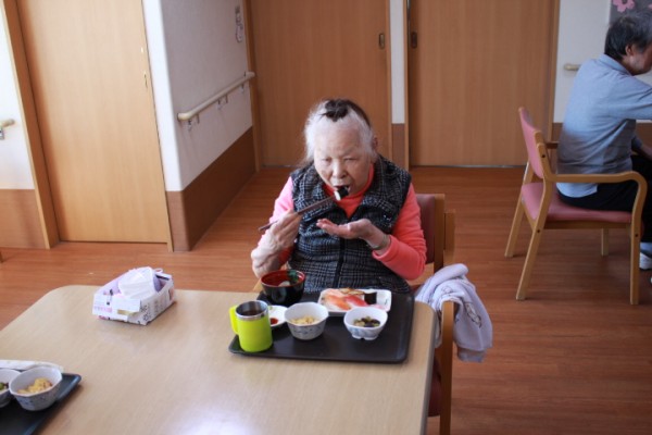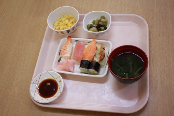 今日は、グループホームみんなの家 蕨の介護ブログをご覧頂き有難う御座います。早いもので、3月になりました。だいぶコロナの新規感染者の数が、少なくなってきましたが油断はできませんゼロにはなっていないので、また、リバウンドも怖いですから油断大敵です。昨日は春の嵐で、風雨がすごかったですね。自然の力はこわいですね!さて、本日は3月3日桃の節句です。どこの施設でも今日のお昼のメニューは、イベント食で、お寿司のメニューが多い事と思います。ここ、グループホームみんなの家 蕨もお寿司でしたが、握り寿司でした。おそらくご利用者の皆様も、ここグループホームみんなの家 蕨に入居されて、初めてだと思いますが、外部の業者に頼むのではなく、いつもと同じ給食メニューでの握りずしは、私も初めてでした。メニューは、握りずし4巻と細巻2個ネタは、キハダマグロ、トラウトサーモン、エビ、蒲焼アナゴ、沢庵巻と副食は、豚肉とゆりねの玉子とじ、三色豆、汁物は蛤のお吸い物に桜餅(桜餅はおやつに回しました。ご利用者様、皆様笑顔で完食されました。