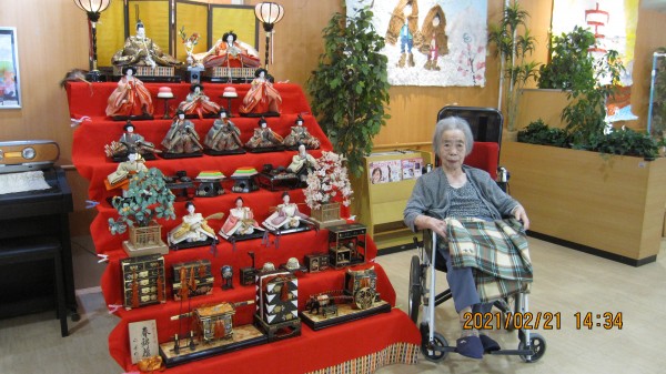 「すこや家 西東京」の ひな人形の前にはまだまだご入居者様が集まってきていただいております。