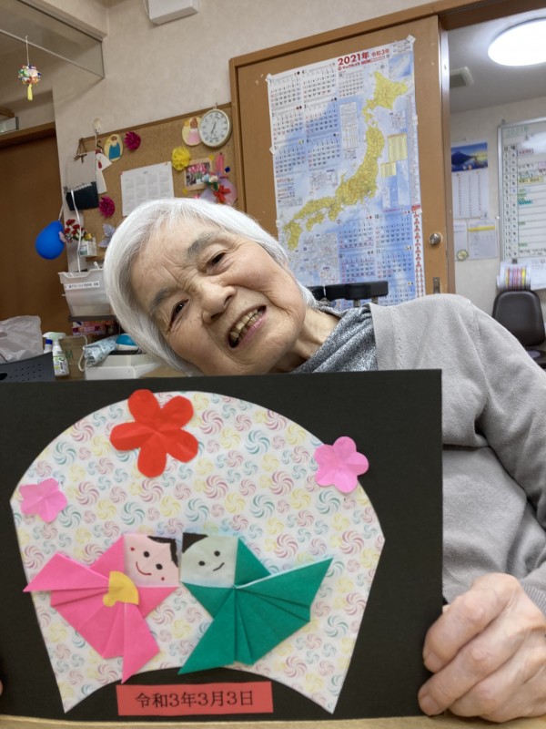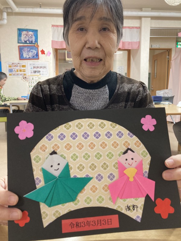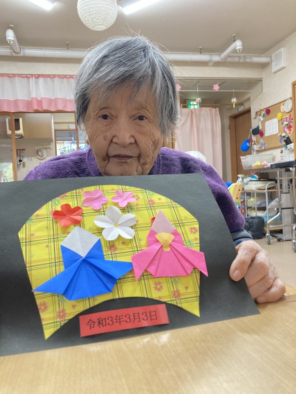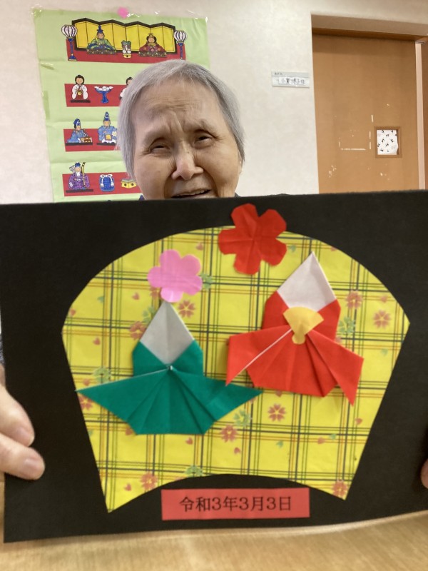 職員の手作りの折紙で作ったお雛様とお内裏様を