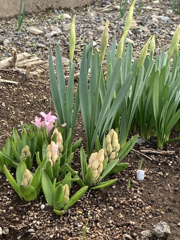 松伏の駐車場や裏庭には,花が植えられています。花桃やヒヤシンスの蕾が大きくなり,花桃は少しずつ花が咲いてきました。