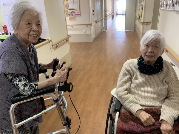 待っていらっしゃる入居者様と、ウォーキング中の入居者様が、お話をされています。