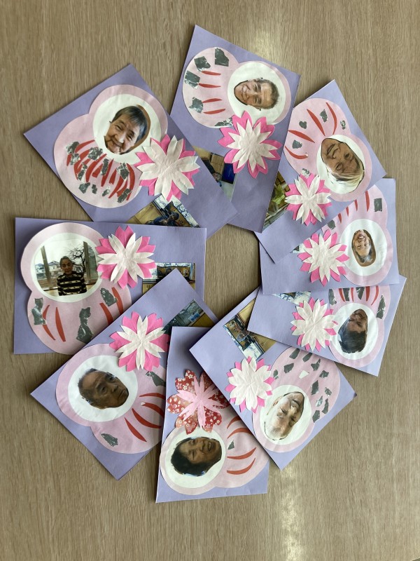今月のご家族様へ郵送させていただく,職員Mの作品は,だるまさんにご入居者様の写真を載せています。