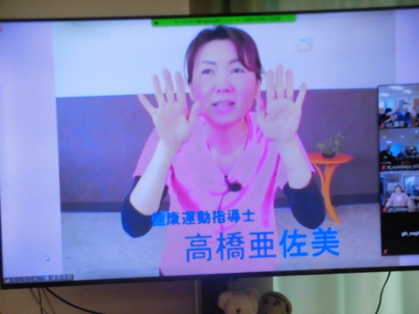 こちらの内容としては、パソコン画面を通してテレビ画面に他の施設の方々を映しつつ、一緒に運動をしていく教室です。