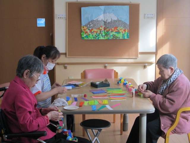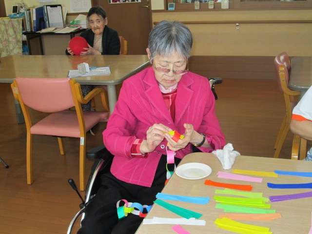 ![]() 短冊に切った折り紙をキレイに色分けして・・・ | ![]() 一つ一つ丁寧につなげていきます |