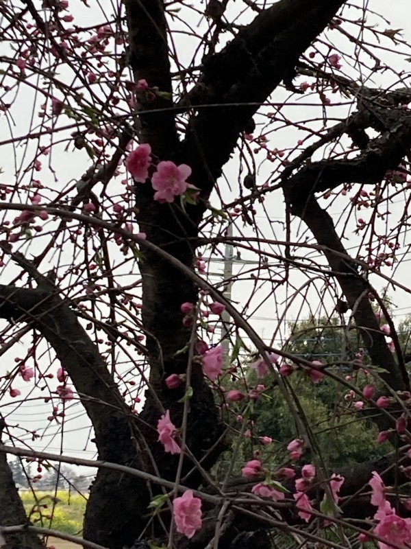 フロアの窓から見える花桃と、年齢不詳の職員Mをモデルに撮影( *´艸`)