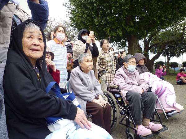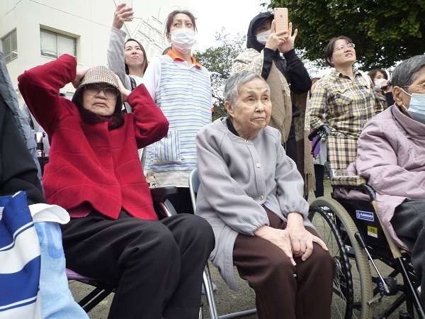 ![]() 利用者様もかわいい子供たちに笑顔、笑顔♪ | ![]() 真剣に応援されていました。 |