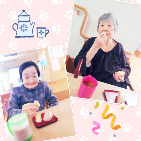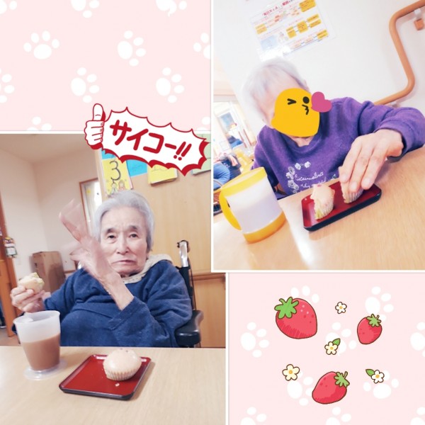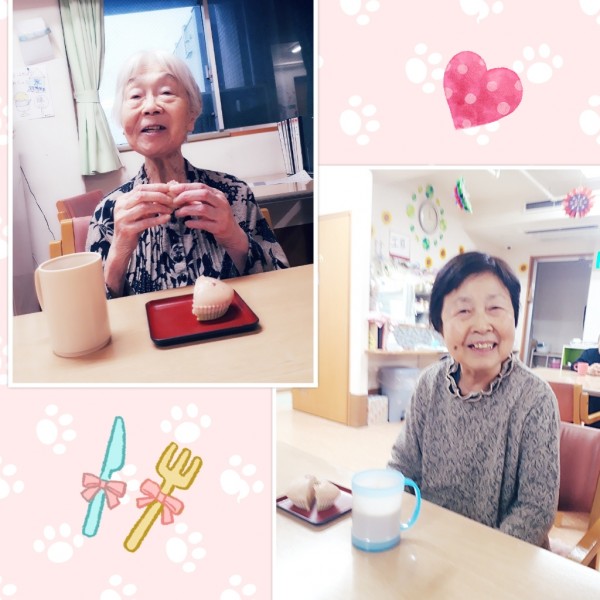 今日のおやつは、ホーム長の手作りの蒸しパンですよ~!と、皆さんに声を掛けると