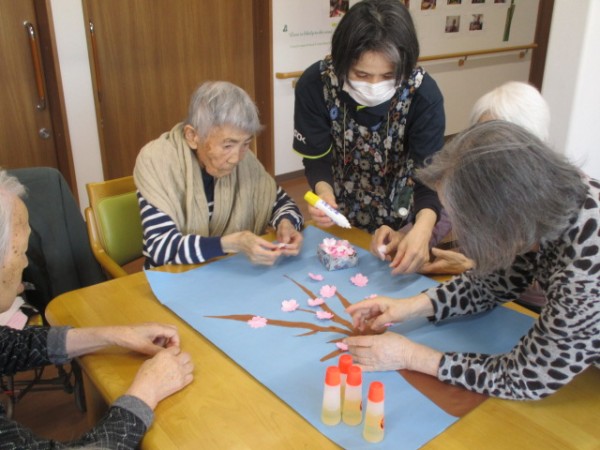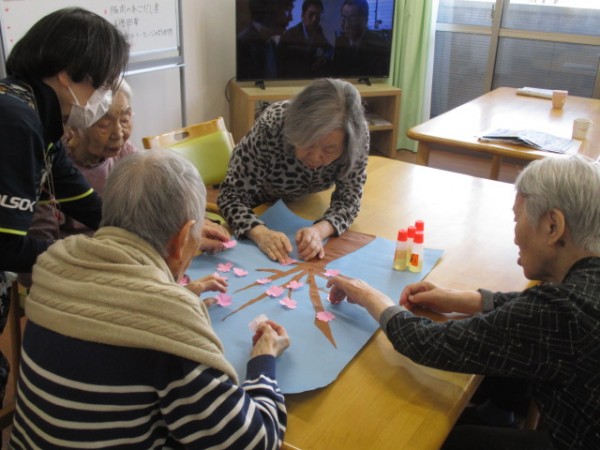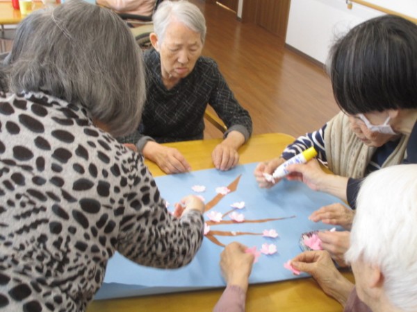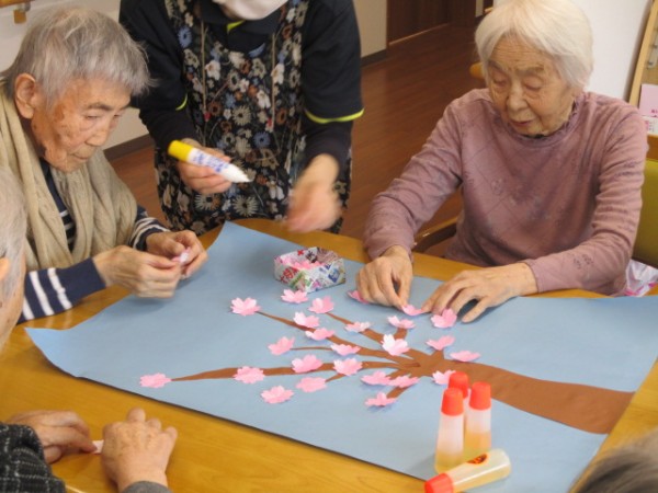 こんにちは!グループホームみんなの家・あきがせの介護ブログです。よろしくお願いいたします。今日は2Fで桜の貼り絵をしました。立派な桜に出来上がりました。皆様、夢中になって花びらを貼って下さっていました。