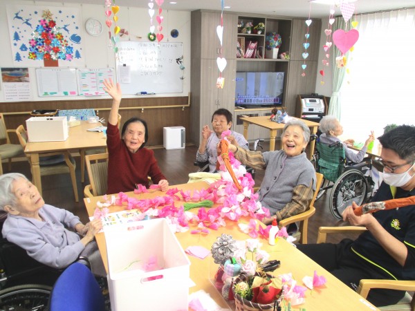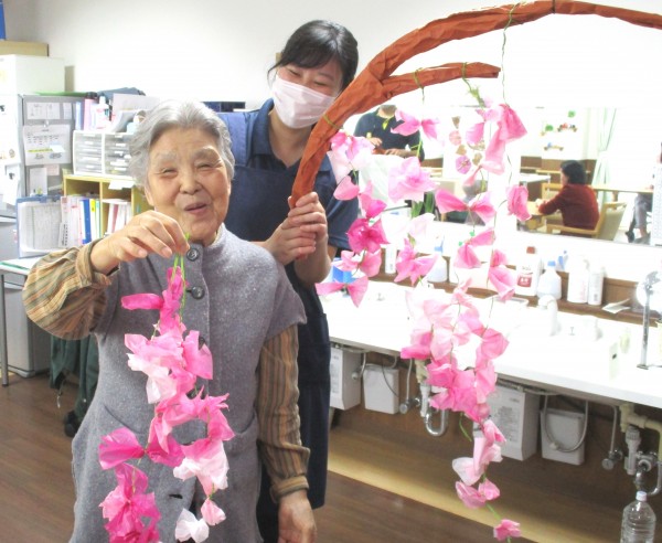 ごつごつの太枝に桜の細枝を沢山下げます。