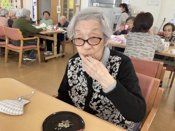 の2021年3月の旨い物会は、桜餅です。ご利用者様皆さん、笑顔で召し上がっていらっしゃいました♥
