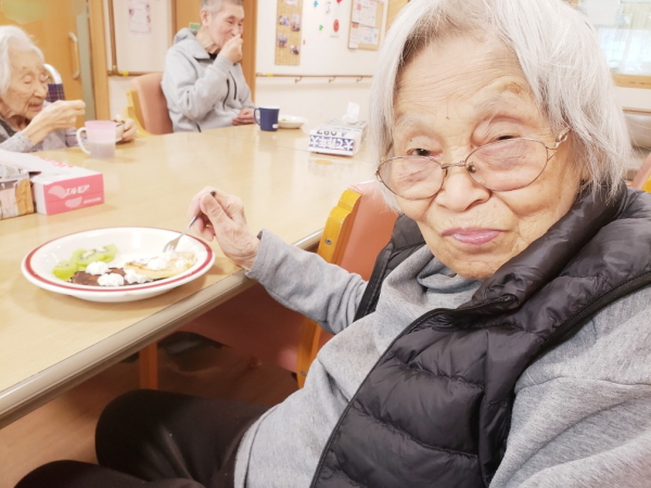 ハッピーバースデーの歌を歌い、おめでとうございますとお祝いの言葉を伝え、皆で手作りケーキを食べました( *´艸`)
