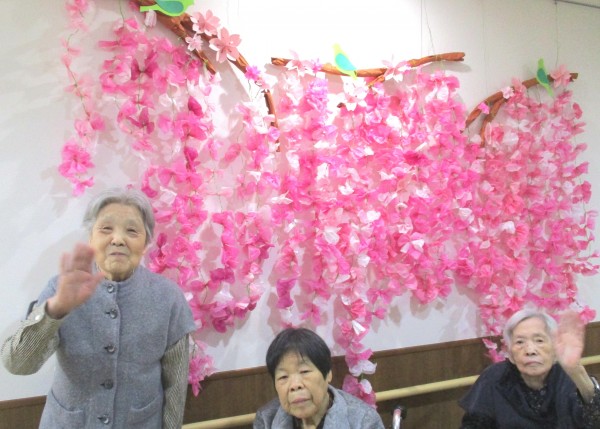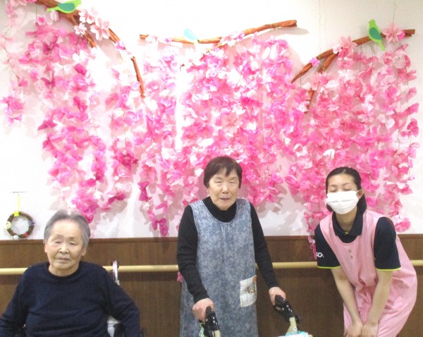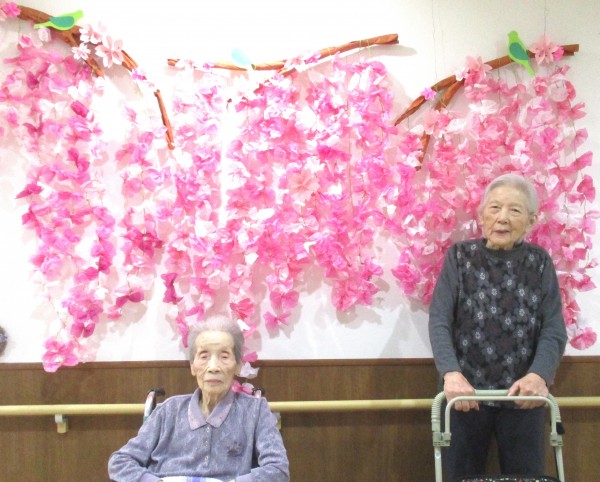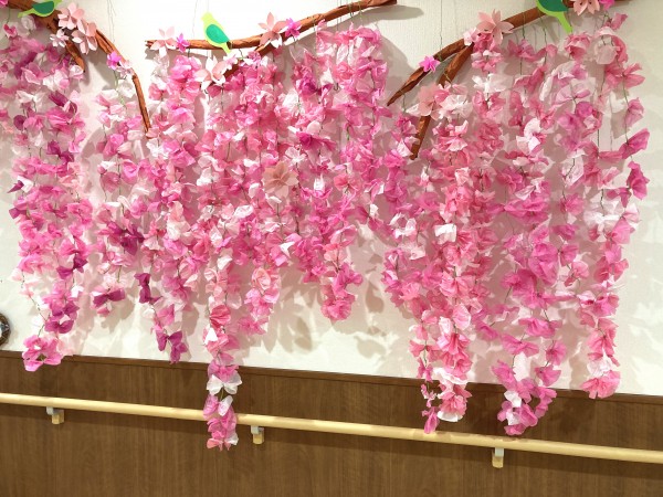 白い壁に濃淡ピンクの花がとても綺麗です。