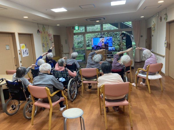 体操がはじまるにつれ、画面の先生の動きを真似するようになり