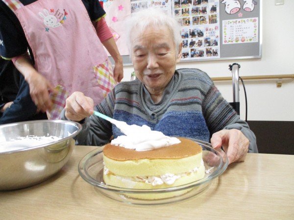 1階の誕生日会ではいつも美味しいケーキを皆さんで手作りしています。
