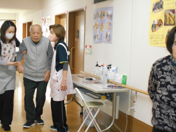 桃フロアの車椅子のご利用者様と一緒に避難口まで誘導!!