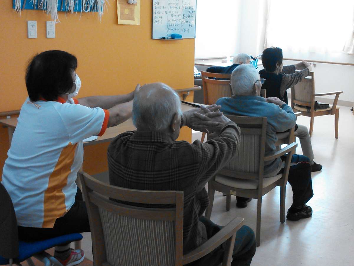カニワ先生のリードで入居者の皆さまはそれぞれ体を動かしあったまっていただきました。