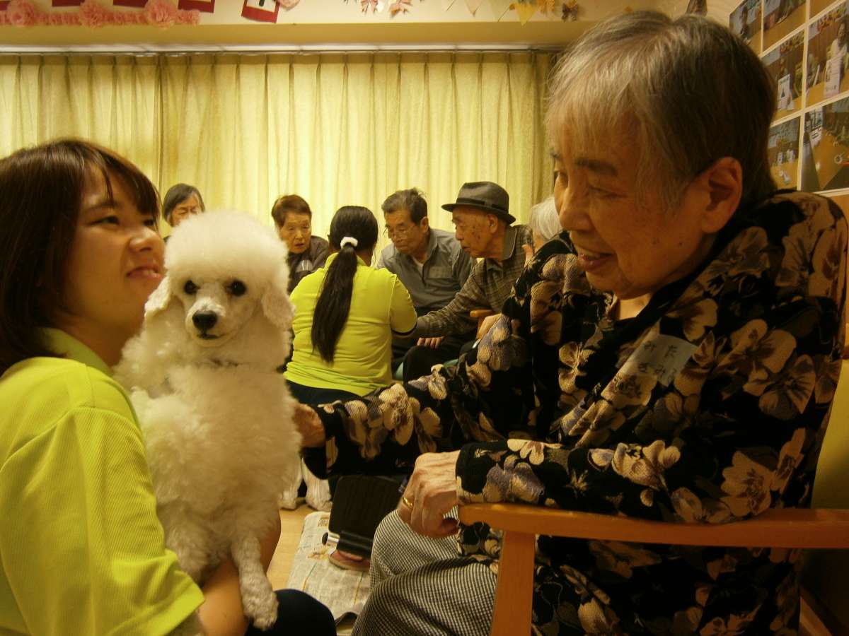 ドッグセラピー ワンちゃんのボランティアが来てくれました! 今年度4回目です。真っ白のフワフワの毛並に皆様うっとり。専門学校の生徒さんによると、訪問の前日にボランティアワンちゃんはお風呂に入るそうです。いい匂いがしました。レットリーバのアスカちゃんは優しい顔で、入居者様になでなでしてもらっていました。 ジャンプや輪くぐりなどなどの芸を見せてくれます。 ワンちゃんに癒されるほんわかしたひと時を過ごしました。(ワンちゃんが苦手な方はワンちゃんが苦手な職員と別室でお茶を飲んでいました)