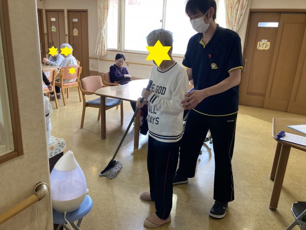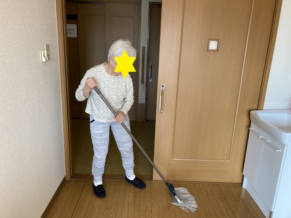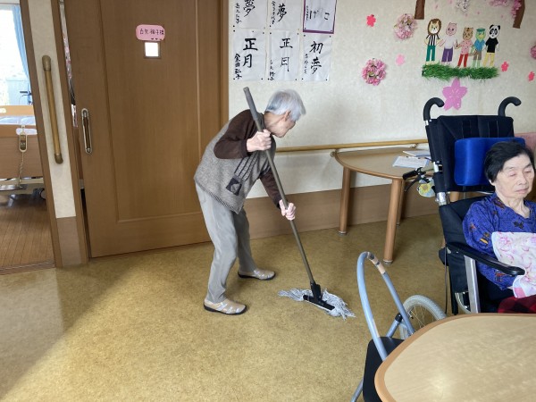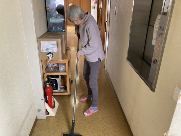 朝食後の軽い運動もかねて、皆さんモップ掛けをして下さっております。